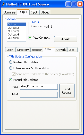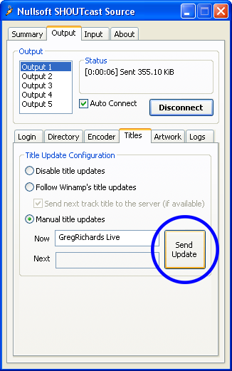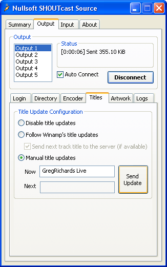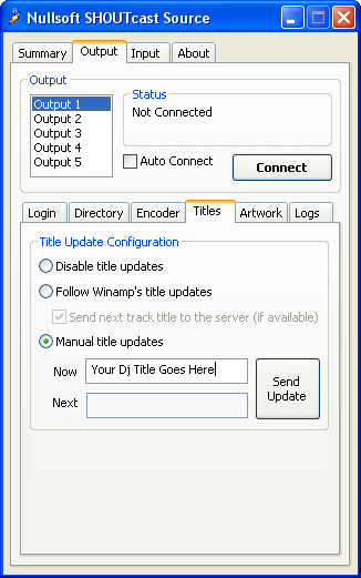 Go back to the "Output" tab in your DSP window. Make sure "Output 1" is selected, and then click the connect button. In the status box above the button, it should give a time and then "Sent xxxx bytes", You are now live". Make sure you stop the playlist first otherwise the "Sent xxxx bytes" won't appear. The link to sop the playlist will be issued to you by the owner. Once you go live, please ensure you click "Send Update" for your dj name to appear on the website.