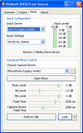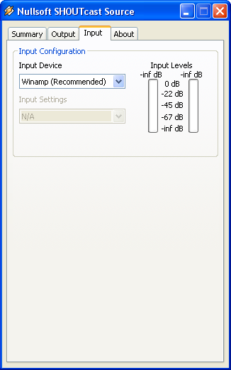 Input settings (select the input audio source) Select the "Input" tab at the top of your DSP window. Unless you have specific soundcard input settings, or want to talk on your stream, select "Winamp" at the Input Device. As every soundcard is different and individual, we cannot give any tutorials for the Soundcard Input. You can choose Soundcard Input option if you want to take audio signal from External Source over the Line In.