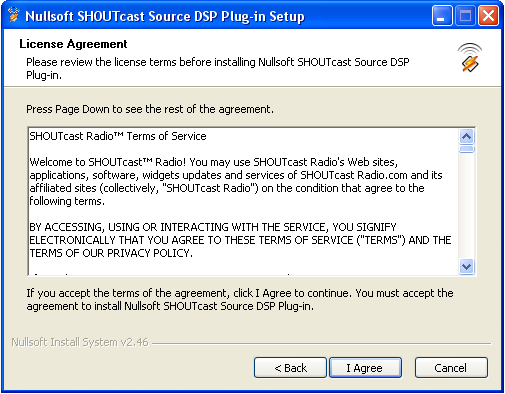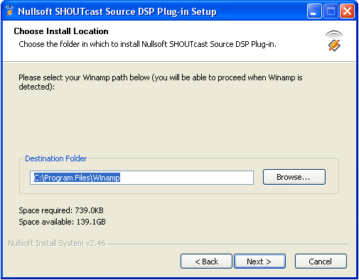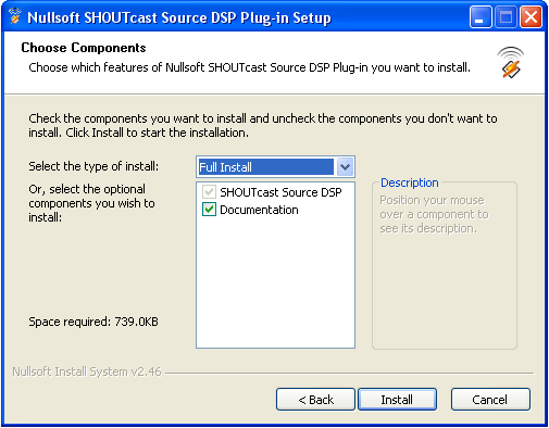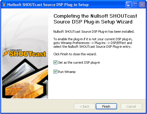 Once the download has completed, you will need to install the software. Verify that Winamp is not running, then double click on the installer that you downloaded and follow the on-screen instructions. When the installation process has completed, start Winamp and open your preferences. Click on "DSP/Effects" in the menu to the left, and highlight "Nullsoft SHOUTcast Source DSP v2.2.3 [dsp_sc.dll]". When you have selected it, a new window should pop up. You may now close your preferences window.
