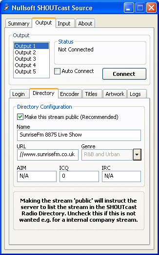 To ensure the station is listed in the SHOUTcast directory, check the "Make this server public" box, and fill in all of the information below the box in a proper manner. Be sure to check the "Manual Title Updates" and enter you dj name followed by Live on the end, this will enable the title to be updated on the website and shoutcast.